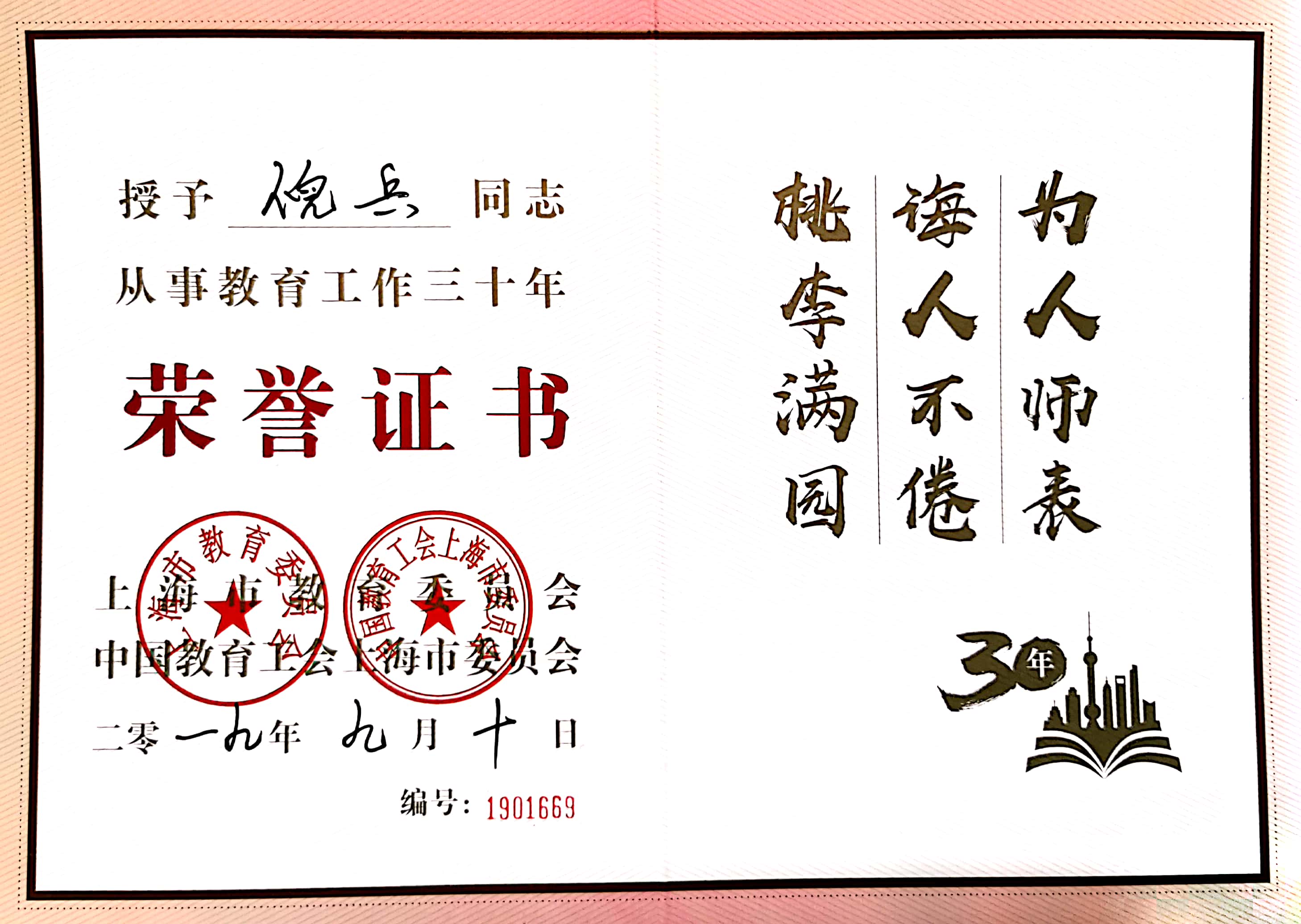 近日,上海市教育委员会、中国教育工会上海市委员会为抖阴 高级工程师倪兵老师颁发了从事教育工作三十年荣誉证书。该证书旨在表彰爱岗敬业、尚礼育人、乐于奉献、具有立德树人的使命感与责任感的长期坚守在教育岗位上的老教师们。