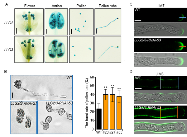 在这项最新的研究中,研究者发现花粉中特异表达的磷脂酰肌醇锚定蛋白LLG2/3能够促进花粉管的生长。LLG2/3的RNAi突变体表现出花粉管生长受阻和破裂率高的表型。细胞壁组分分析发现,在LLG2/3敲减突变体的花粉管中,甲酯化和去甲酯化的果胶的积累均上升,而纤维素减少,这些因素可能导致了花粉管细胞壁的脆弱和易破(图1)。
