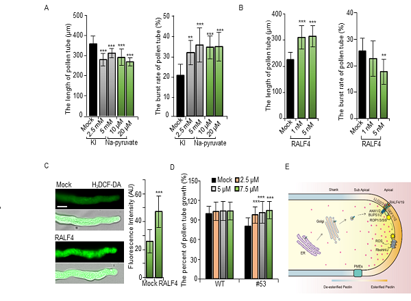 在下游信号通路的研究中发现,活性氧(ROS)影响花粉管的生长和破裂。RALF4能够诱导ROS的产生,促进花粉管的生长,以及降低花粉管破裂率。LLG2/3敲减突变体中,ROS的水平明显降低,而体外施加H2O2,能明显恢复突变体的花粉管生长缺陷。进一步的ROP pull-down实验建立起LLG2/3和ROP通路的联系(图4)。这些结果表明,花粉管的生长和花粉壁的稳态维持可能通过RALF4/19-LLG2/3-ANX/BUPS复合体调控下游的ROP-ROS途径通路来维持。
