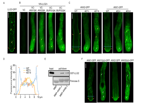 双分子荧光互补实验结果表明,LLG2/3和ANX/BUPS的相互作用发生在花粉管中。进一步地,ANX/BUPS胞外近膜区(J)和LLG2/3发生相互作用,缺失ANX/BUPSexJM造成ANX/BUPS的胞内滞留(图3)。