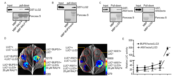 进一步地生化分析发现,LLG2/3和RALF4/19以及ANXUR/BUPS直接相互作用,并且LLG2/3以RALF4浓度依赖的方式和ANXUR/BUPS发生相互作用(图2)。这些结果表明,ANX/BUPS-LLG2/3可能以受体-共受体复合体的形式共同调控花粉管的生长。