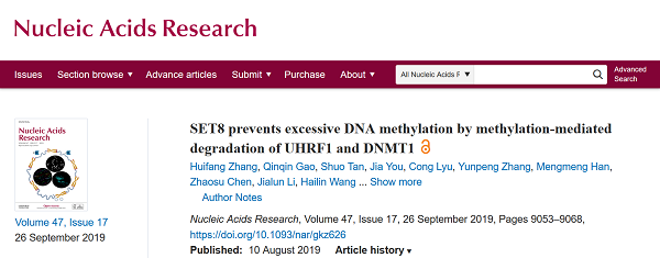 近日,该研究的相关论文《SET8 prevents excessive DNA methylation by methylation-mediated degradation of UHRF1 and DNMT1》已在SCI一区期刊Nucleic Acids Research(IF = 11.147)上在线发表。